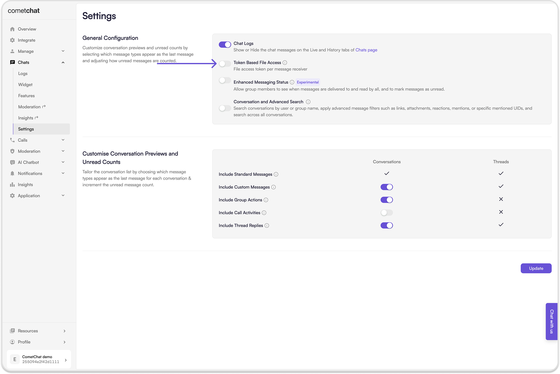 Token-based file access provides improved control over media files through pre-signed URLs. When this feature is enabled, media URLs in webhook payloads may return a 401 Unauthorized response. You can enable this feature in the Settings section under Chats in the CometChat dashboard. Once enabled, it cannot be disabled.
