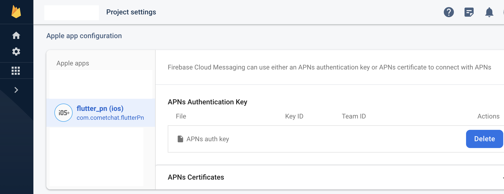 In your Firebase Console, go to project settings and upload the .p8 file obtained from the Apple Developer dashboard along with the Key ID and Team ID.