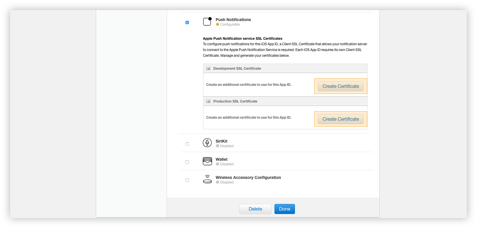 - Under the Push Notifications service, choose which SSL certificate to create either Development or Production.