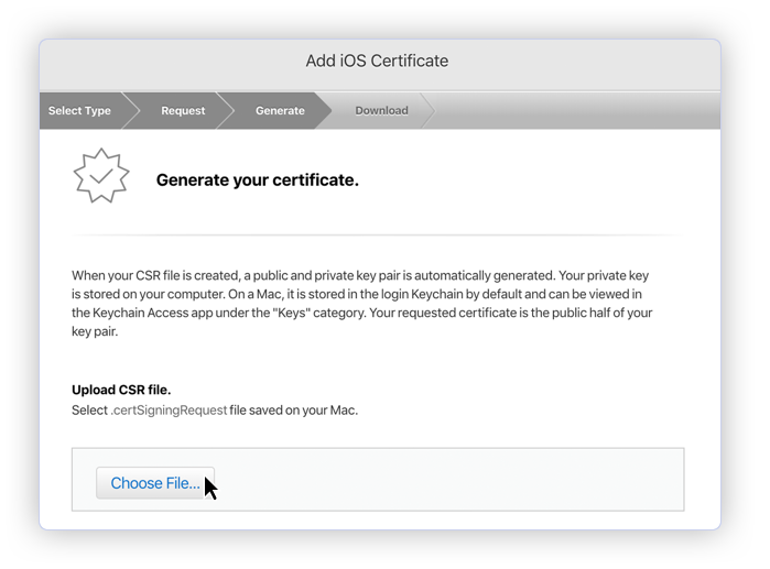 - In the Generate your certificate pane that appears after the selection, under Upload CSR file., upload the CSR file you created through the Choose File… button. To complete the process, choose Continue. When the certificate is ready, choose Download to save it to your Mac.