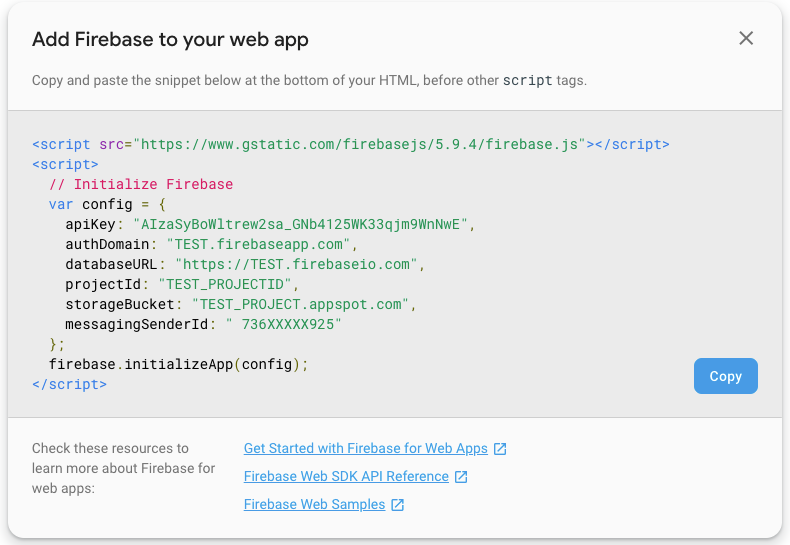 3. Scroll down and copy the Firebase SDK snippet and paste in the <head> tag of your index.html file.