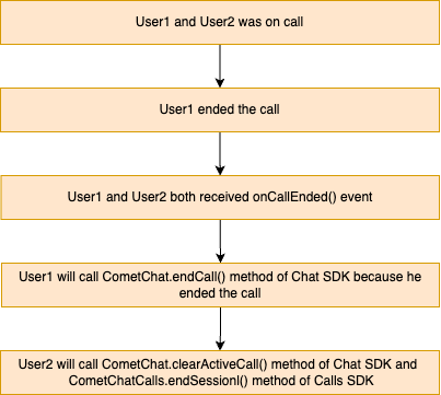 The user who pressed the end call button will call the CometChat.endCall() method, and the another user how was on call will call the two methods which is CometChat.clearActiveCall() and CometChatCalls.endSession() methods to release the calling resources