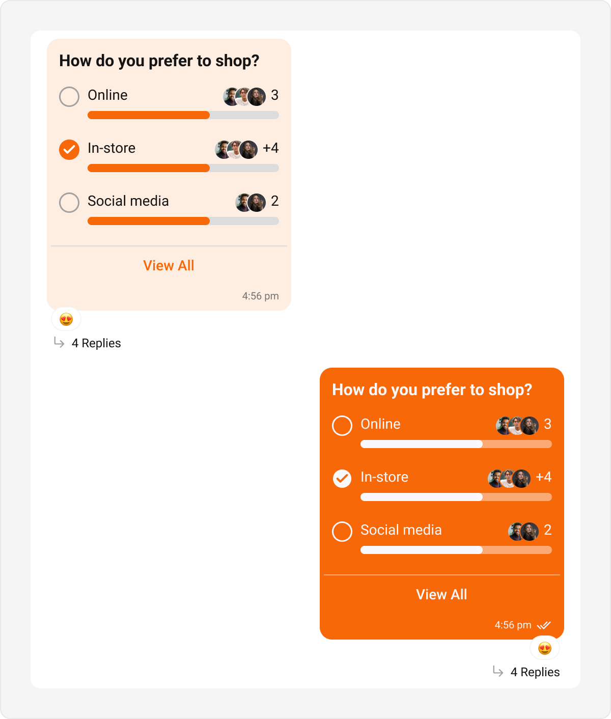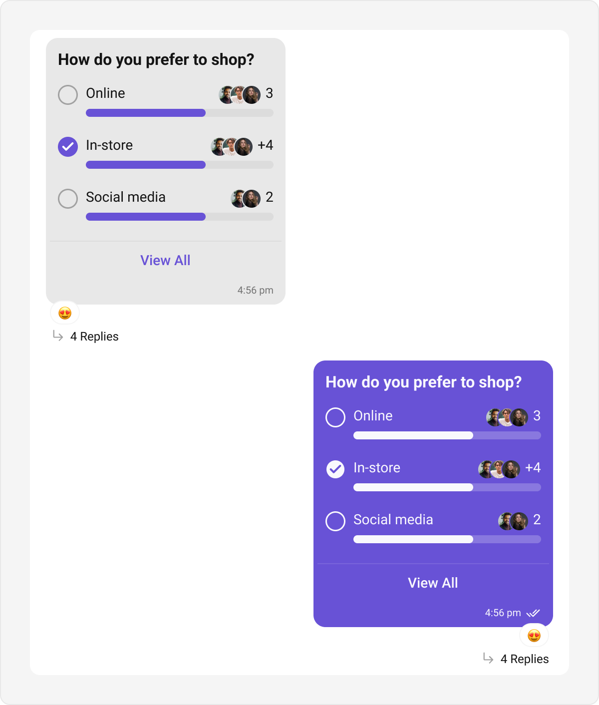 Poll bubbles represent polls shared within the chat, showing options and results. Default