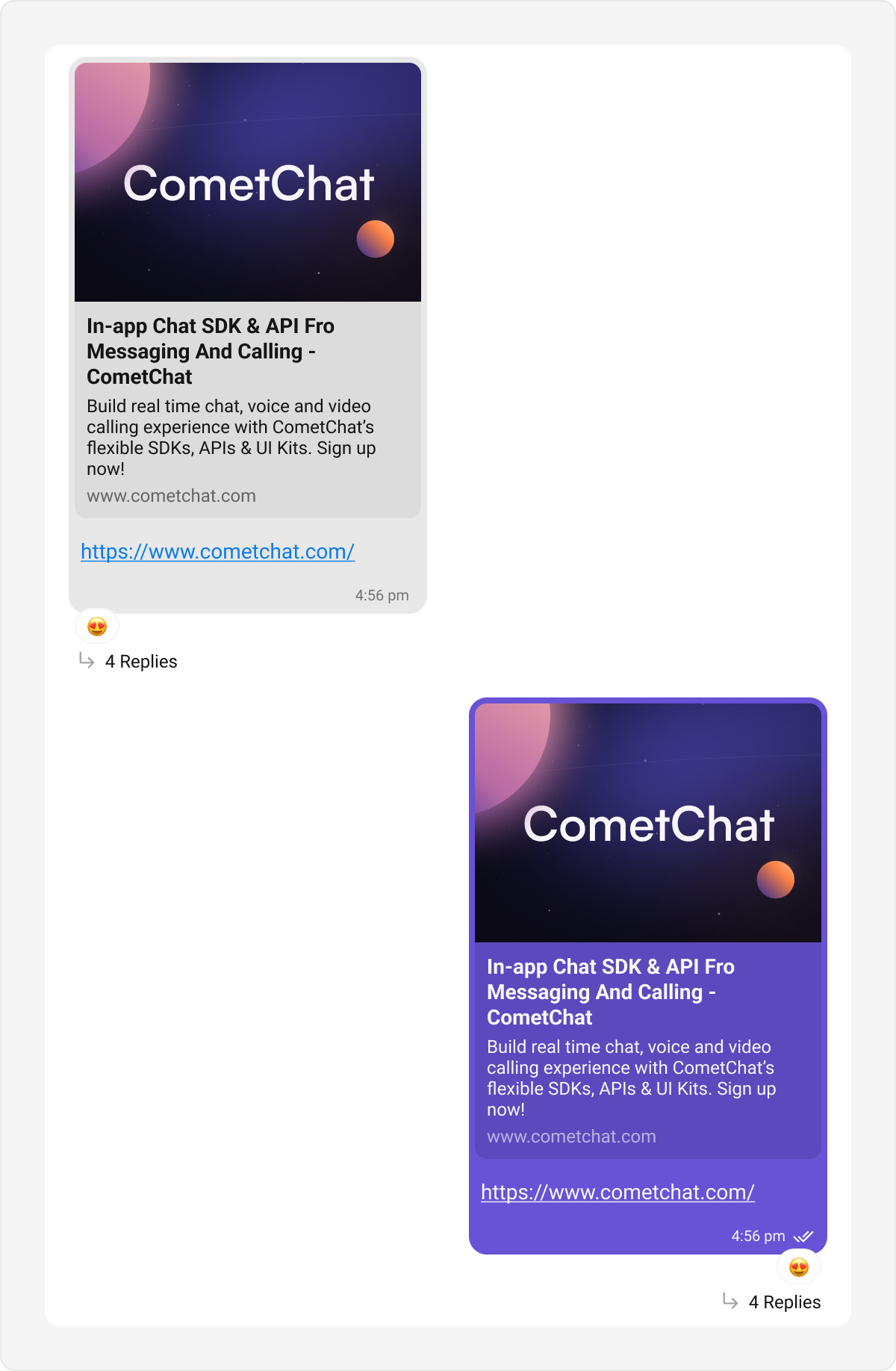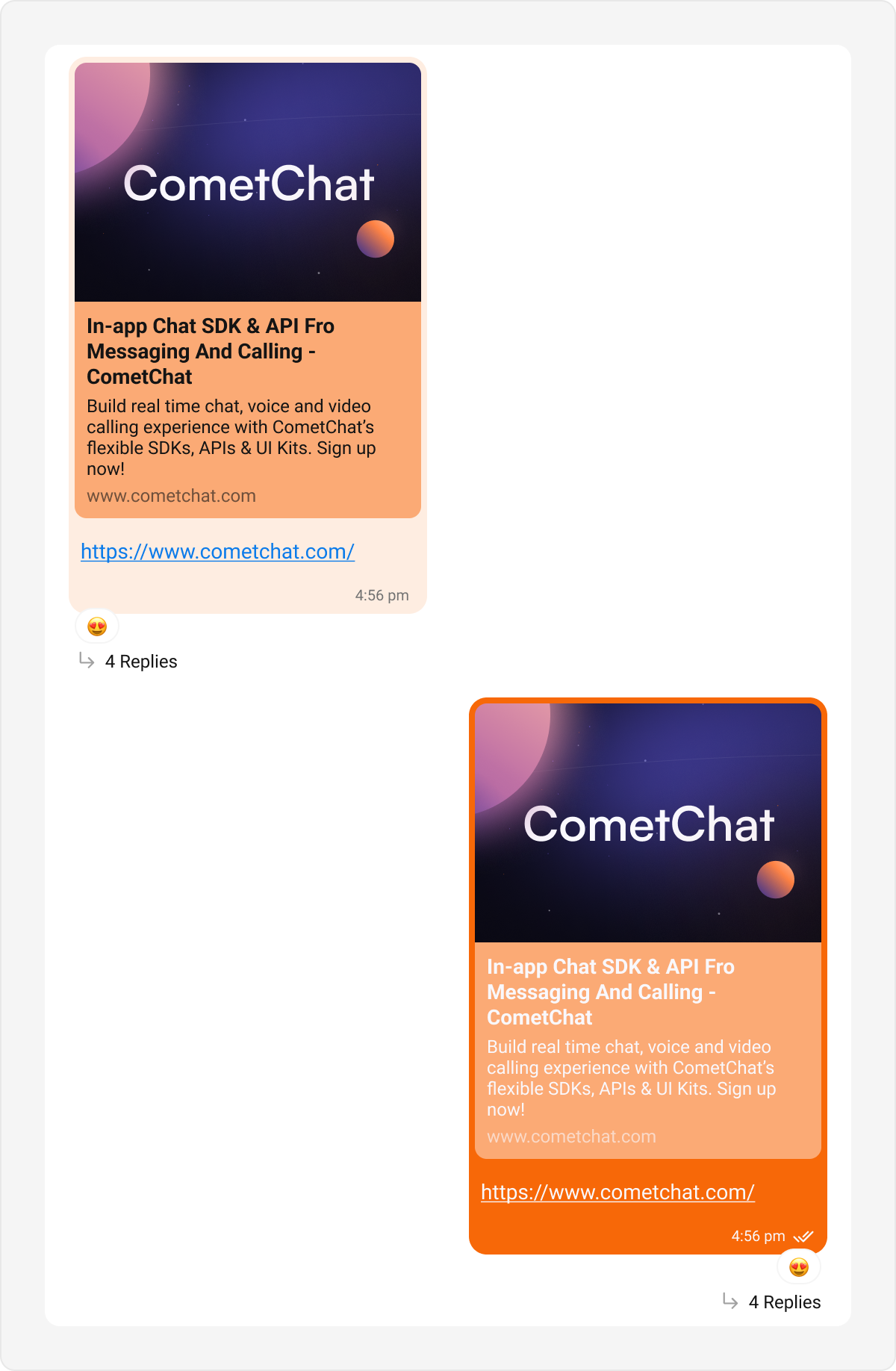 To know more such attributes, visit the attributes file. The Link Preview Bubble is designed to display a preview of links shared in messages. It enriches the messaging experience by showing details such as the page title, description, and an image from the linked content, making links more engaging and informative. Default