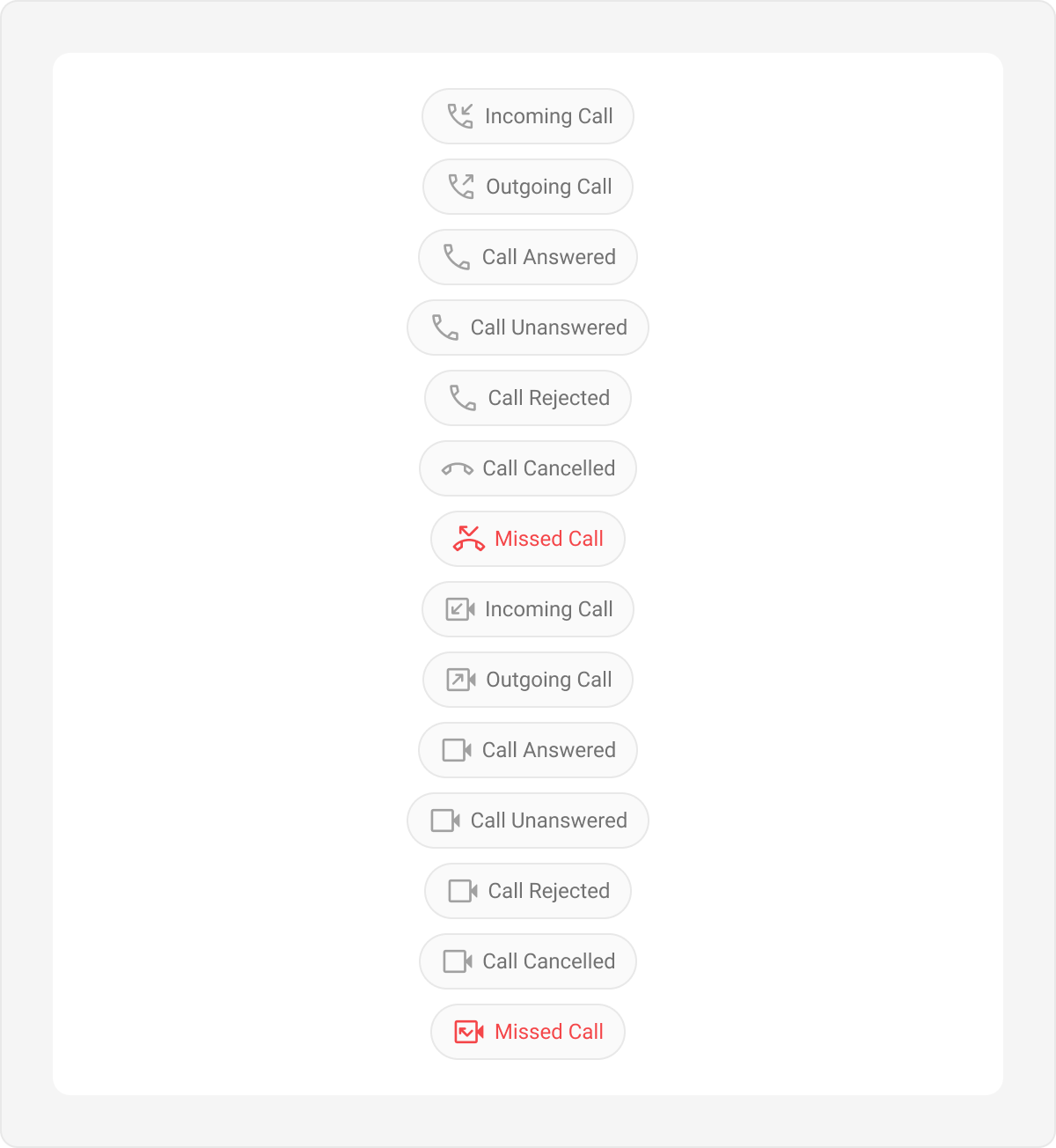 Call action bubbles display call-related actions, such as missed calls, in the chat interface. Default