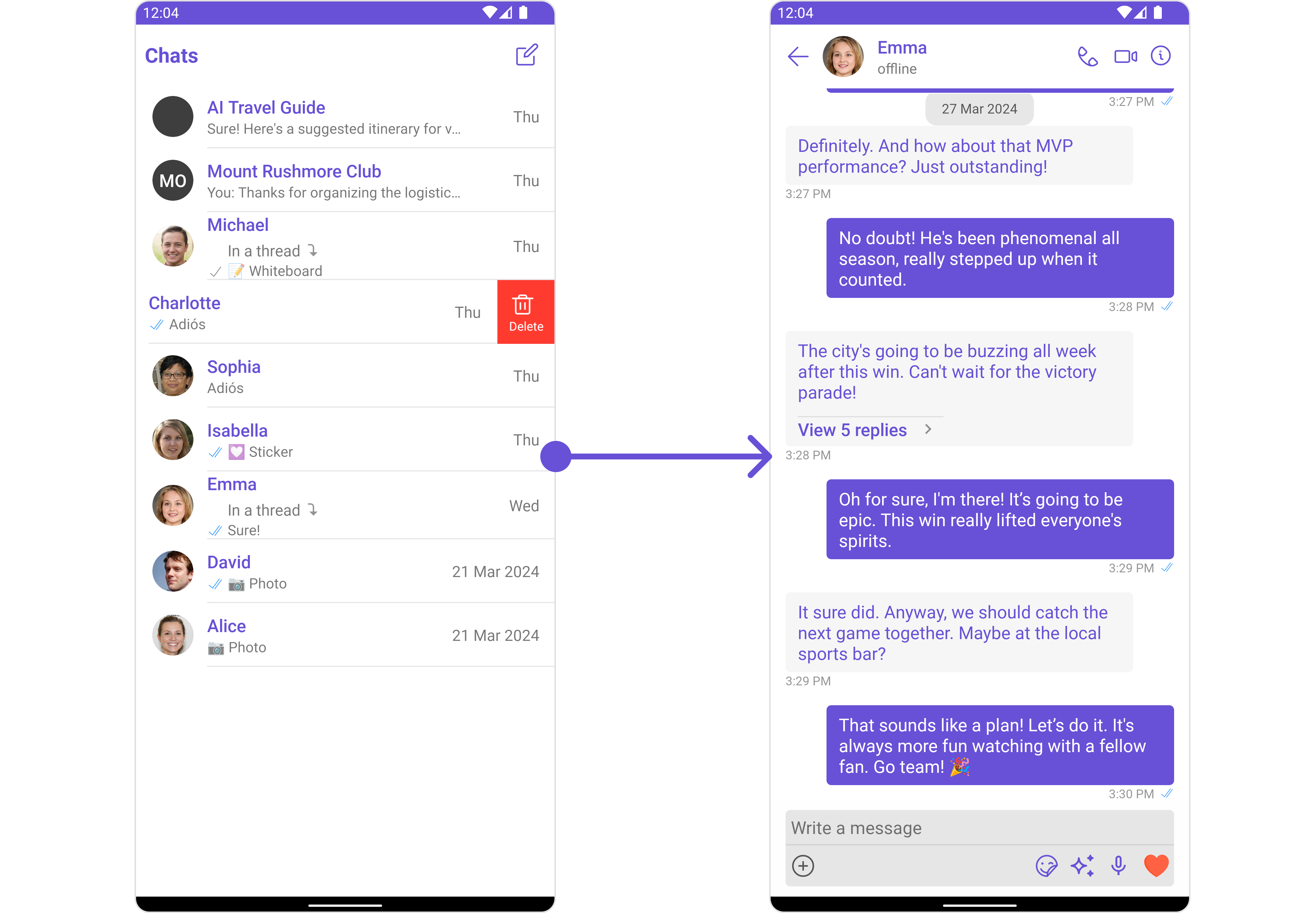 | Conversations | Conversations is a Component that renders Conversations item List, Conversation item also displays the delivery status of the last message providing users with real-time updates on the status of their messages. |