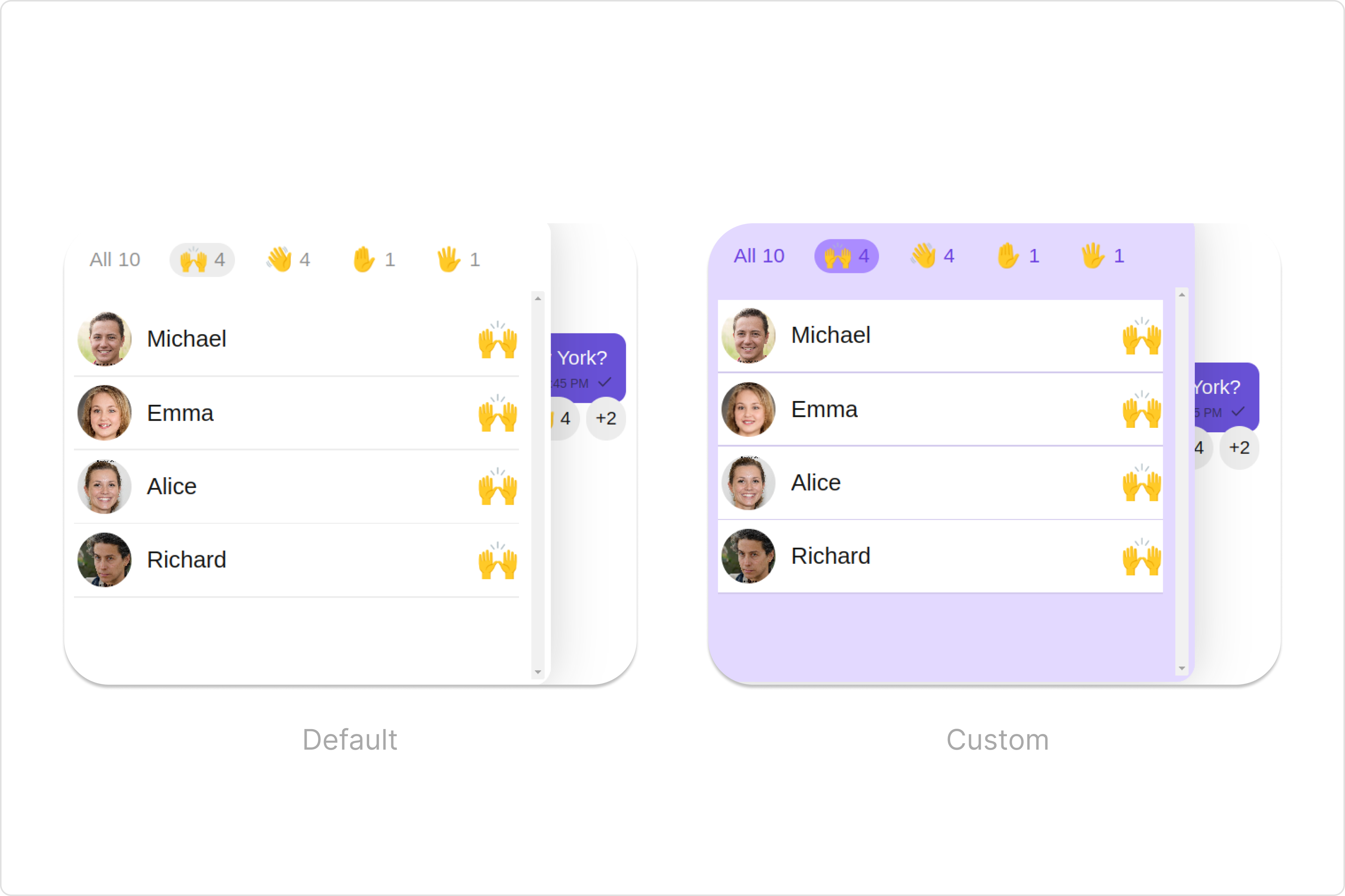 To fit your app’s design requirements, you can customize the appearance of the Reaction List component. We provide exposed methods that allow you to modify the experience and behavior according to your specific needs.