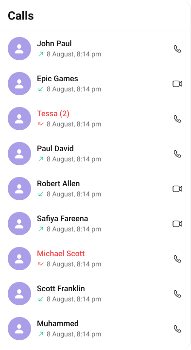 CometChatCallLogs is a Component that shows the list of Call Log available . By default, names are shown for all listed users, along with their avatar if available.