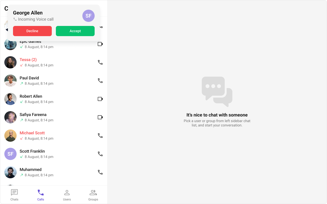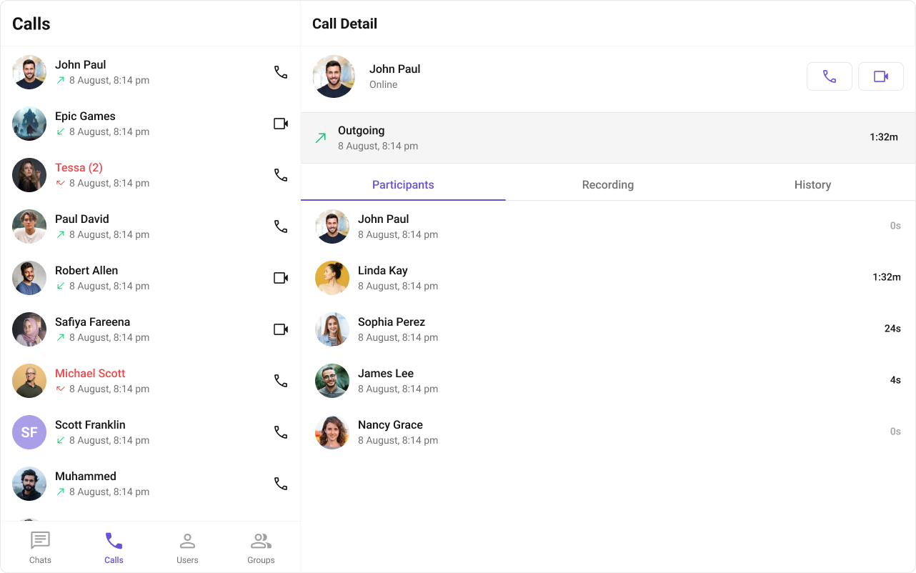 Call Logs component provides you with the records call events such as who called who, the time of the call, and the duration of the call. This information can be fetched from the CometChat server and displayed in a structured format for users to view their past call activities.
